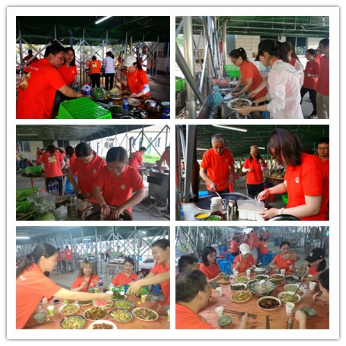 幾輪遊戲下來,大家的能量消耗大半。此時,營地工作人員已經準備好新鮮的食材等待大家野炊了。在接下來的時間裏,大家支起大鍋灶,你洗菜我燒菜,分工合作井然有序。團隊中的廚神也大展身手,在有限的條件下做出了一道道美味的佳肴。溫暖的陽光伴著嫋嫋的炊煙,這頓來之不易的“舌尖上的野味”大家吃的格外香甜!沒有了遊戲競爭的激烈,所有隊伍歸於一起,仿佛一家人,其樂融融,交頭接耳,互相問候!